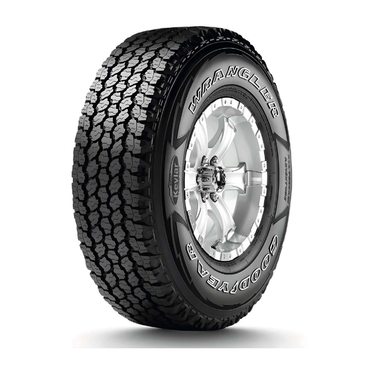 Para conductores con un estilo de vida que demandan máximo desempeño y resistencia en todo terreno, la Wrangler All Terrain Adventure ha sido creada. Características y Beneficios: En la Wrangler All Terrain Adventure encontrará la maxima resistencia hacia perforaciones debido a que cuenta con una capa adicional de Kevlar ( material para fabricar chalecos anti-balas ) y que reduce el riesgo de ocasionarlas. Cuenta con protección adicional en el costado del neumático que reduce el riesgo de ocasionar cortes o pinchaduras. Extraordinaria tracción en lodo y grava debido a que cuenta con bloques de piso con diseño agresivo y profundos surcos que ayudan a evacuar el lodo. Tracción Off-Road. Tracción en piso seco y mojado. Cuenta con la tecnología Durawall. Neumático diseñado para usarse al 50% dentro y 50% fuera de carretera.